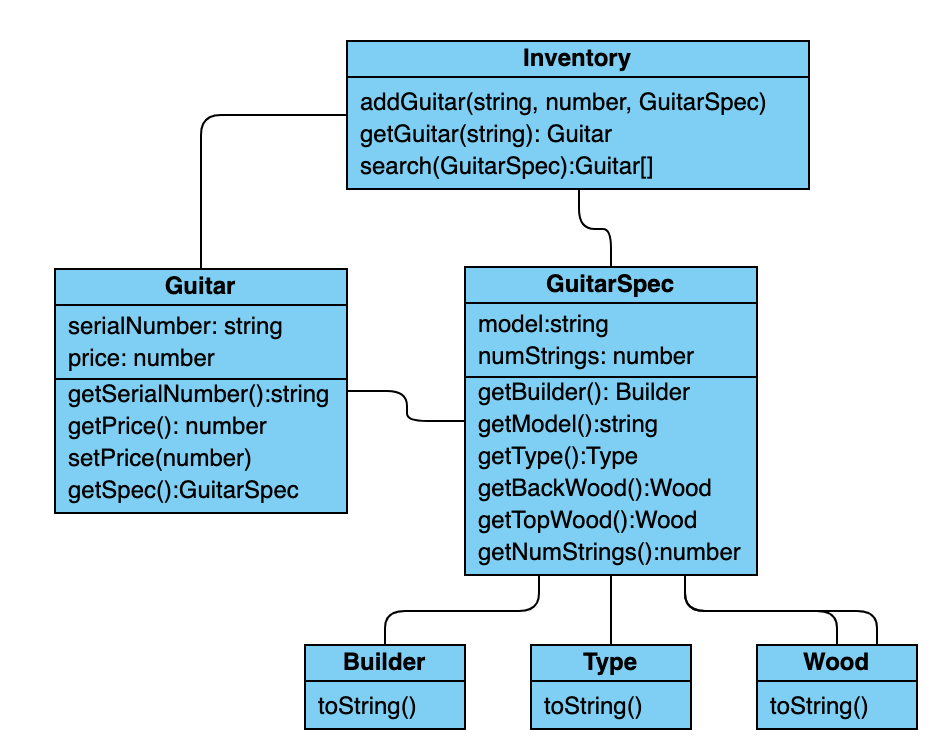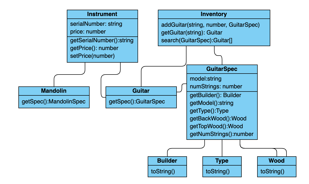 물론 검색 기능은 잘 돌아간다. 캡슐화, 중복 코드 피하기, 확장성이 좋게 만들기 등의 객체지향 원리를 녹였다. 물론 새로운 악기 타입을 추가하기에는 많은 작업이 필요하다. 재사용성은 어렵다. 모두 단단히 연결되었고, InstrumentSpec이 Instrument의 일부이다.