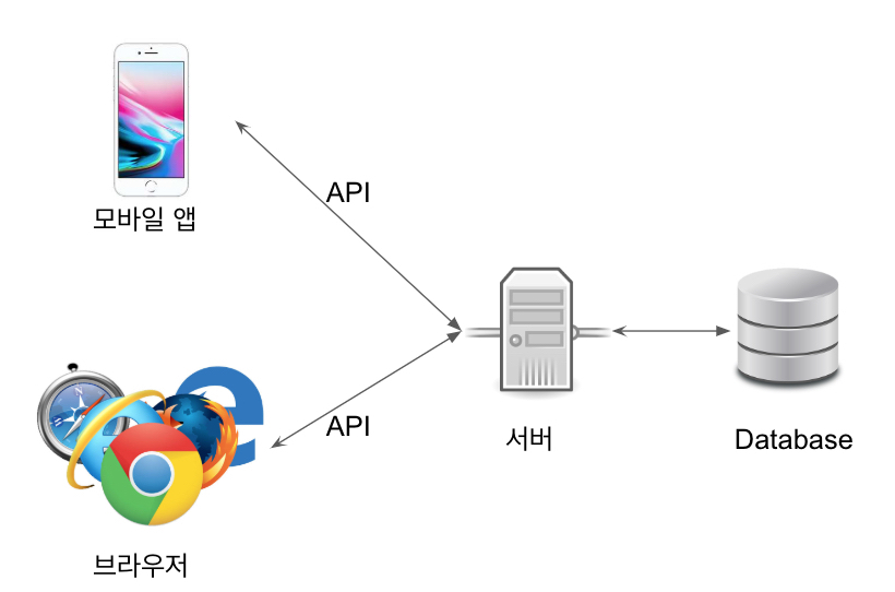 모바일 앱과 브라우저를 통해서 사용자와 소프트웨어는 상호작용 합니다. 서버에서는 API라는 것을 정해서 API를 통해서 앱/브라우저와 상호작용하는데요, API(Application Programming Interface)는 쉽게 말하자면 웹 사이트(혹은 앱)와 서버 간에 소통의 언어를 맞춰 주는 것입니다.
