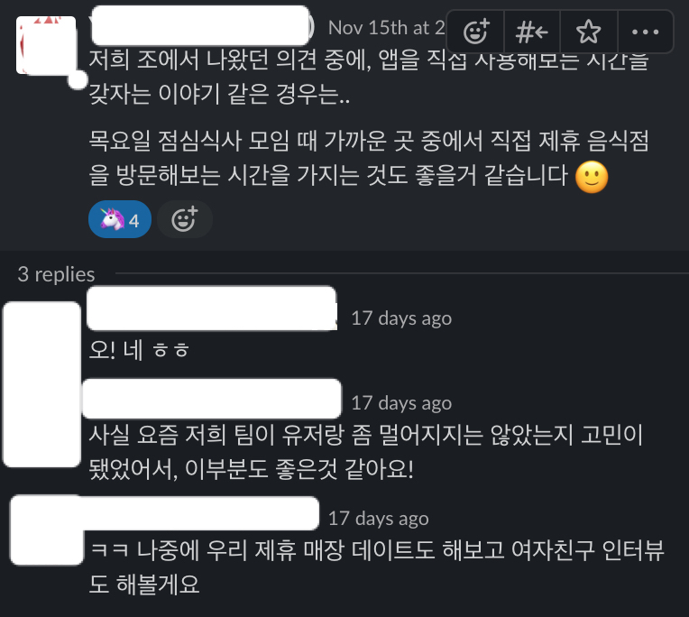 마침 우리 조직에서는 매주 목요일마다 그룹을 나누어 식사하는 모임을 가지고 있었다. 그래서 이 시간을 활용해서, 회사 근처의 제휴 음식점을 직접 방문해보는 시간을 가지며 앱 사용자의 입장을 이해해보는 시간을 갖는 것으로 피드백이 강화(?) 되었고, 더 좋은 의견으로 발전할 수 있었다.
