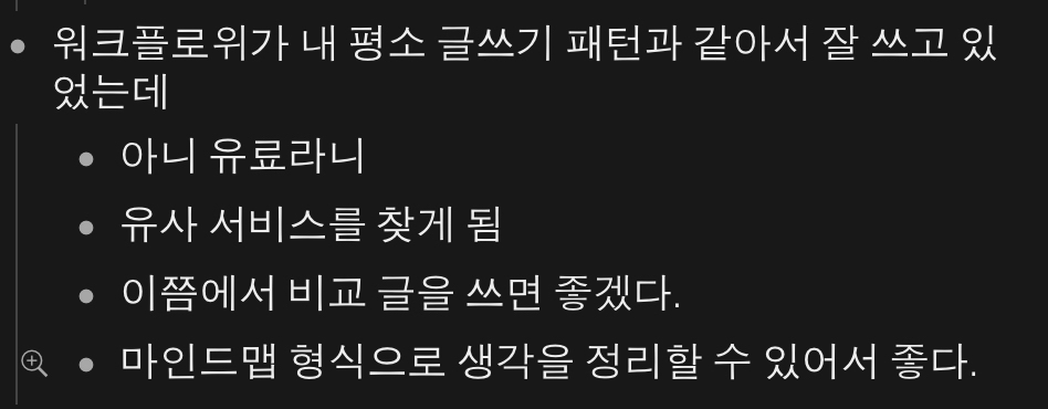 그러나 워크플로위를 이용해서 파편화된 생각을 정리해나가는 과정은 내게 매우 유용하고 포기할 수 없는 부분이었다. 평소에도 기록하는 패턴이 하나의 큰 주제를 가지고, 마인드맵 형식으로 가지를 뻗어나가는 식으로 기록을 해나갔던 나였기에 포기할 수 없는 부분이었다. 사실 이 글도 그러한 마인드맵의 한 가지에서 뻗어나와 써내려간 글이다.